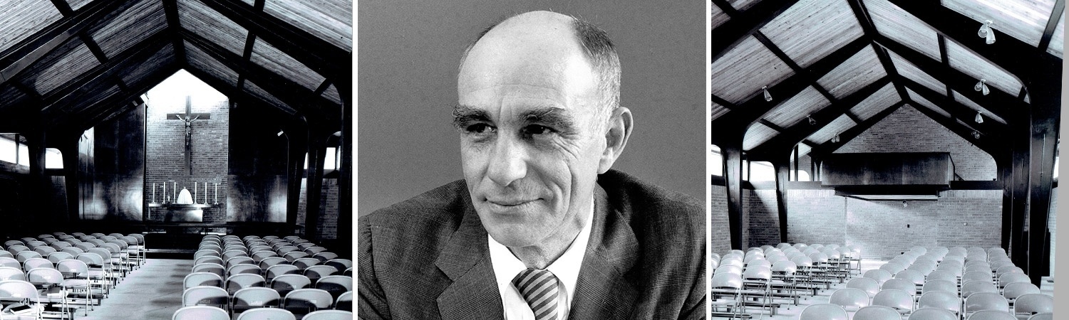 Architect Ed Dart's contempory plan for St. Michael's Church was chosen over traditional designs. He is shown above between photos of the nave before pews, stained glass windows or the pipe organ were installed.